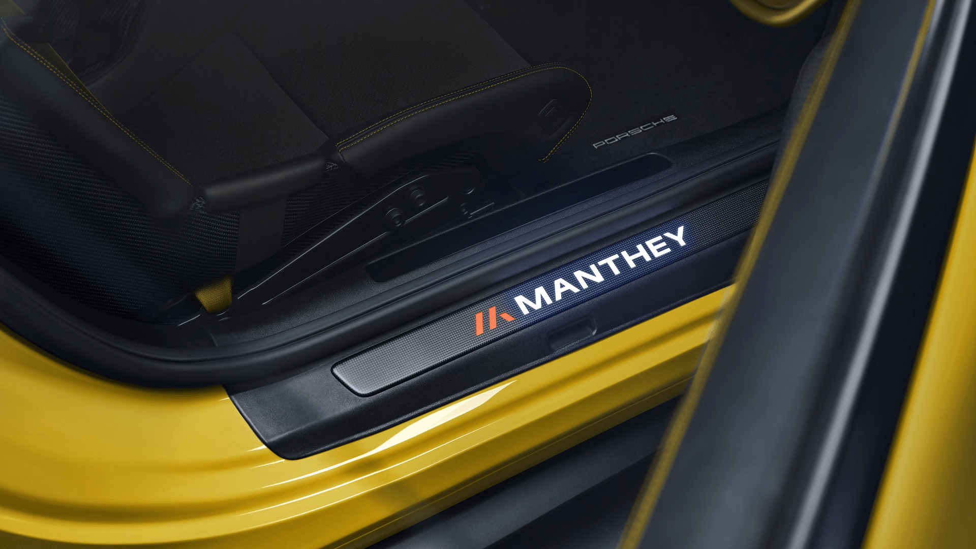 Illuminated door trims in matte carbon with red and white Manthey lettering. LED door projectors casting white Manthey logos onto the pavement. Optional door graphics in white or black for additional individuality.